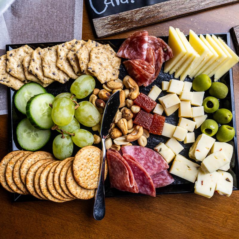 Includes the cheese and charcuterie tray with cheese and meat from Otto’s Cheese Shop and the hummus dip trio plus a little chocolate.